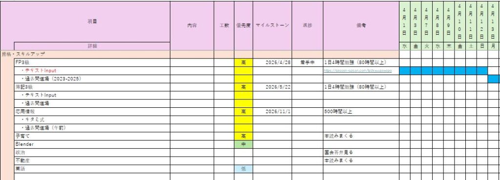 生まれるまでの産休期間中に完了できるかも含めて計画を立て、下記のようにExcelで可視化しました。